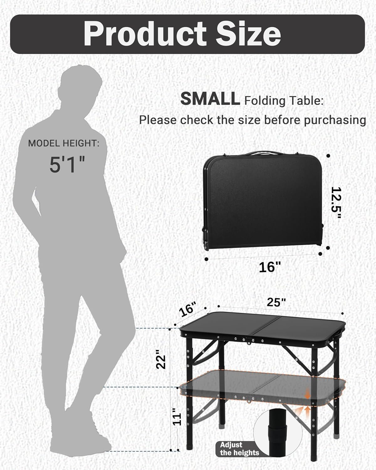 Reinforced Small Folding Table Portable, Small Foldable Camping Table, Heavy-Duty Mini Folding | Adjustable Height | Lightweight Premium Aluminum with Handle | Black 25″x16″x22″