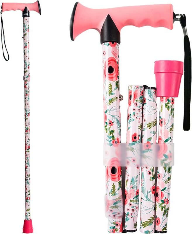 - Foldable Design: Walking cane can be quickly folded for convenient storage. This folding cane can be collapsed in 4 interconnected sections when not using it. It’s the perfect size put it into your tote bag, backpack, large purse when you travel. 5 levels height adjustable from 33 inch to 38 inch in 1 inch increment.